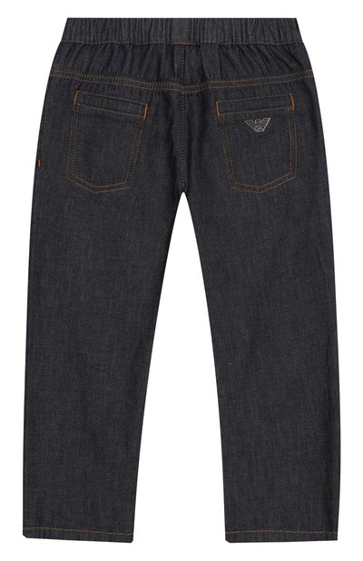 Широкие джинсы с пятью карманами выполнили из неэластичного денима. Модель со слегка неравномерным окрашиванием декорировали сзади металлической накладкой в виде тотемного орла.
