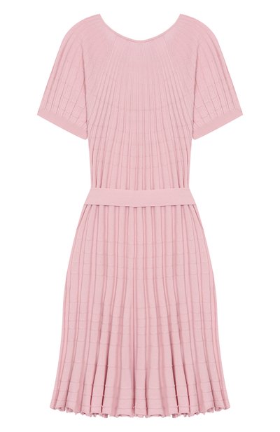 Платье с жаккардовым паттерном из монограммы EA на лифе выполнили из смесового трикотажа на основе вискозы и полиэстера. На подоле изделия сформировали односторонние складки.