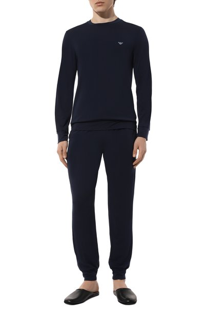 Для изготовления пижамы использовали джерси из чистого хлопка. Лонгслив декорировали вышивкой в виде тотемного орла, а брюки с боковыми карманами – брендированным паттерном и логотипом на широком поясе-резинке.