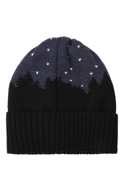 Шапку бини связали эластичным узором из пряжи на основе шерсти первого пострига с добавлением акрила. На широком отвороте модель декорировали рельефным логотипом марки.