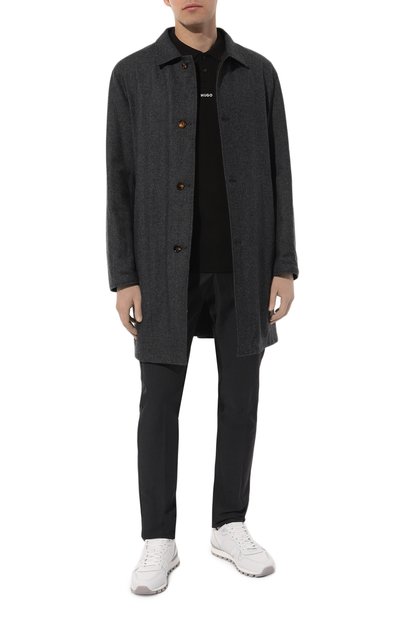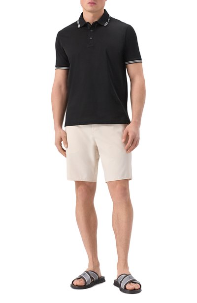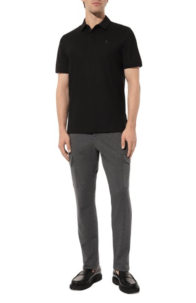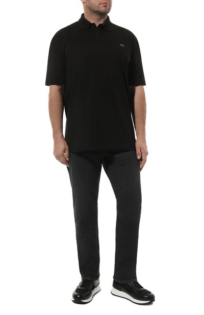 Поло прямого кроя выполнили из хлопкового пике. Воротник модели с короткими разрезами по бокам декорировали логотипом марки, вышитым контрастной нитью.