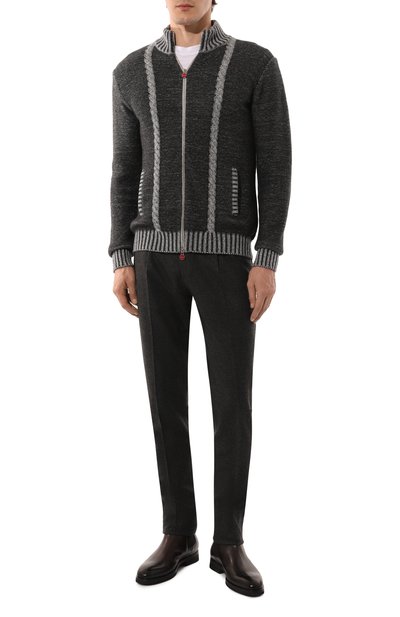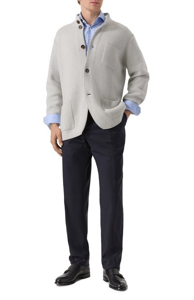 Кардиган с шалевым воротником застегивается а кцентными брендированными пуговицами. Для создания модели использовали кашемировый трикотаж в крупный рубчик.