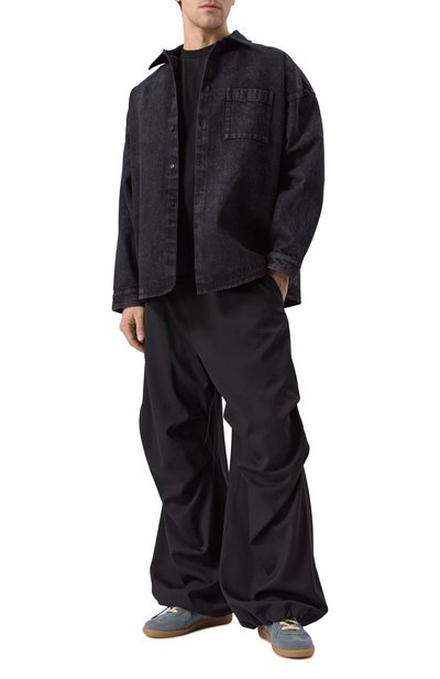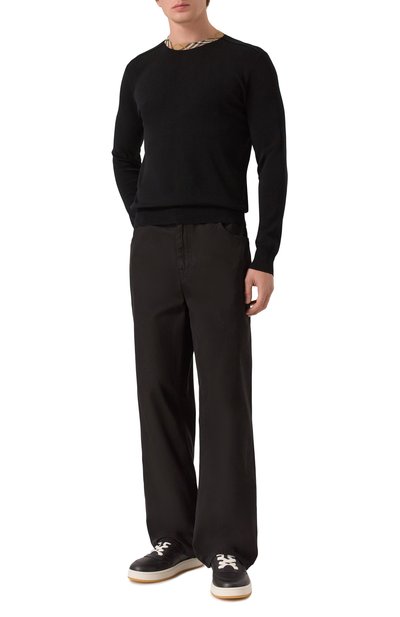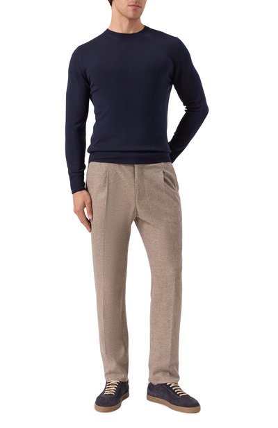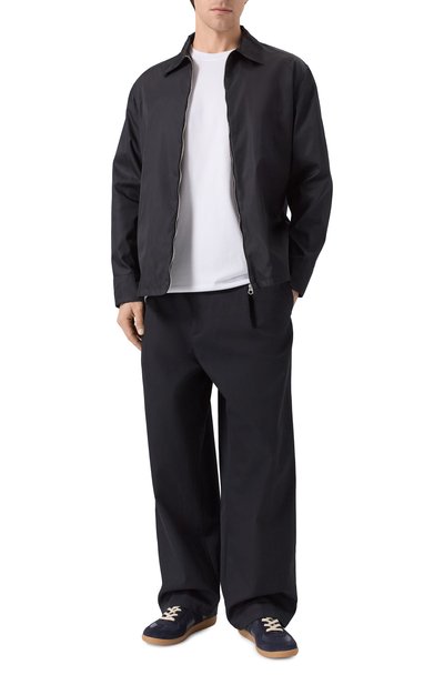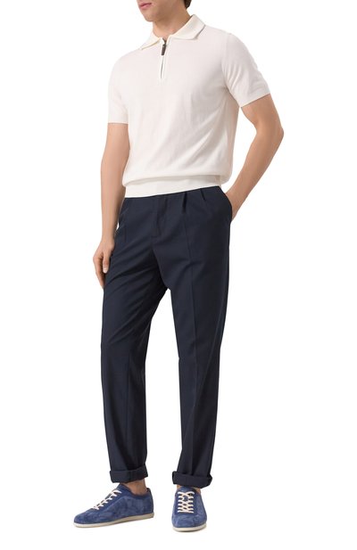 Кеды на контрастной резиновой подошве выполнили из стираной замши оттенка Azure. Кожаные язычок и фигурную накладку на заднике модели украсили логотипом и эмблемой Solomeo.