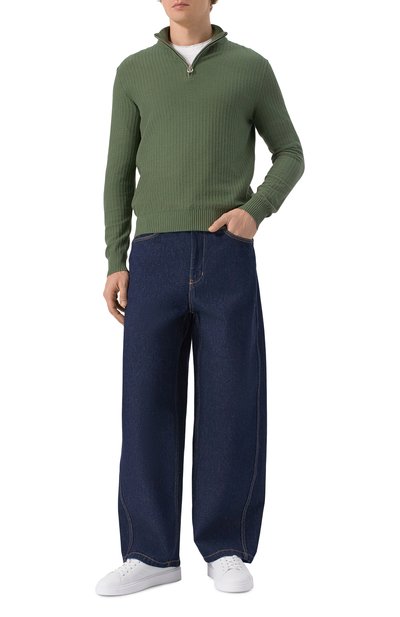 Пуловер с V-образной горловиной, манжетами и поясом в рубчик связали из шерсти мериноса толщиной 13,5 микрон. Модель будет гармонично смотреться в повседневном образе любой сложности.
