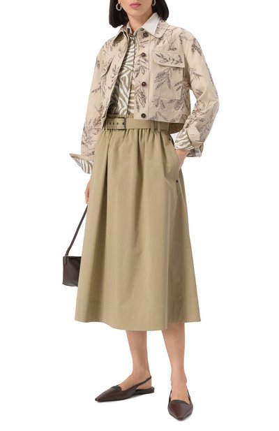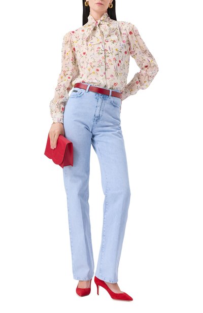 Для пошива рубашки с принтом Cherryfic использовали крепдешин из чистого шелка. Модель с воротником-стойкой застегивается перламутровыми брендированными пуговицами.