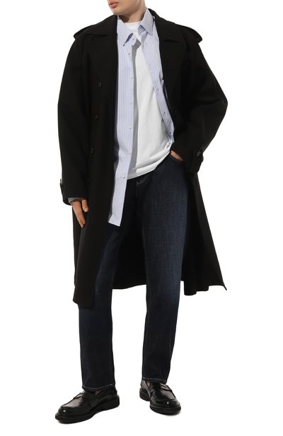 Прямые джинсы с контрастными строчками сшили из хлопкового денима с добавлением эластана. Модель дополнили пятью карманами, подчеркнув правый задний фирменной двухслойной пластиной.