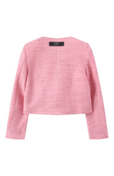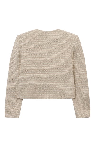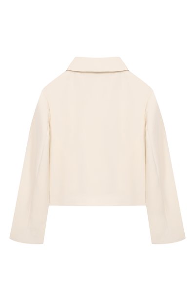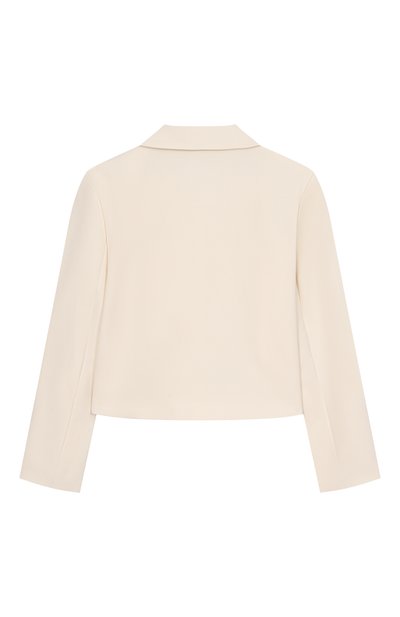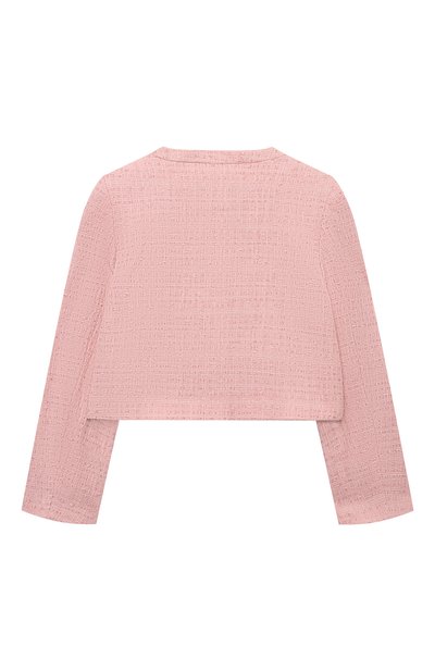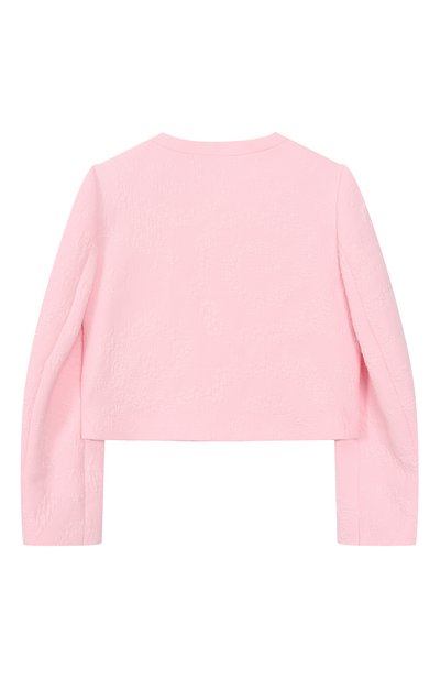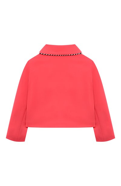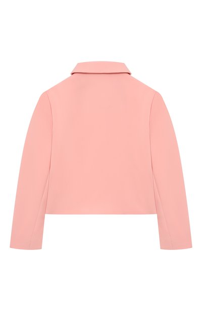 Жакет с супатной застежкой и отложным воротником выполнили из микса полиэстера и полиуретана. Спереди модель украсили фирменной эмблемой и атласными бантами в тон, покрытыми стразами.