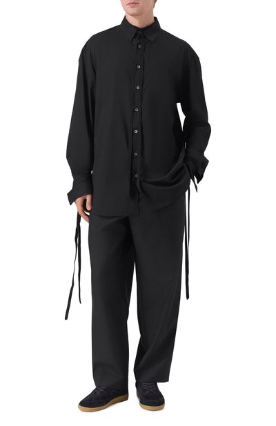 Рубашку Concordians Island с прямоугольными манжетами выполнили из фактурной ткани на основе органического хлопка и шерсти. Модель с клапаном, скрывающим V-образный вырез, застегивается потайными пуговицами.