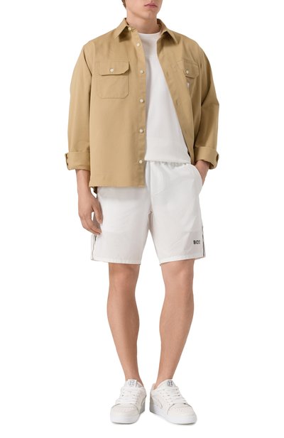 Плавки-шорты Iconic с поясом-кулиской сшиты из эластомультиэстера. Модель с подкладом и тремя карманами дополнена лампасами в цветах фирменного триколора и небольшим логотипом марки.