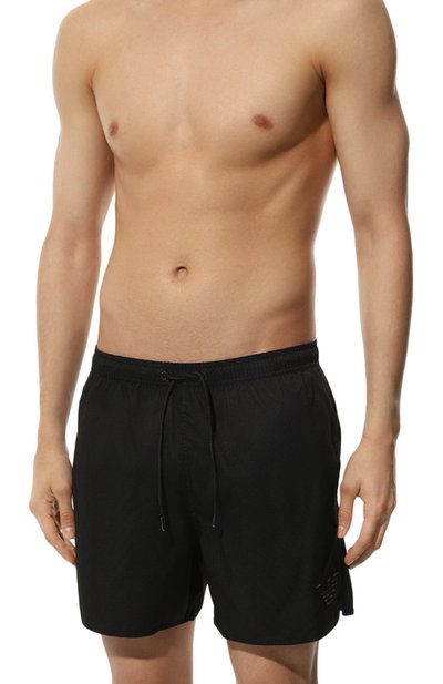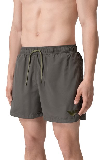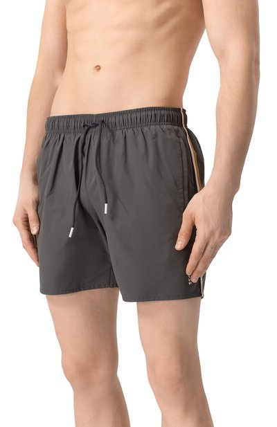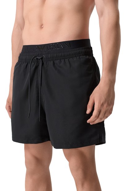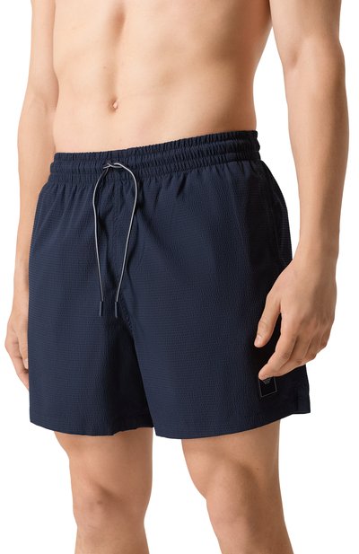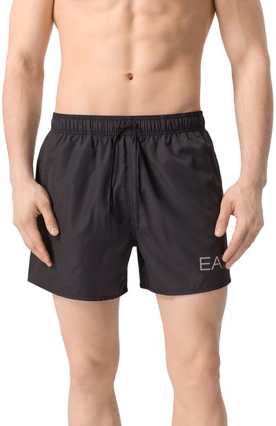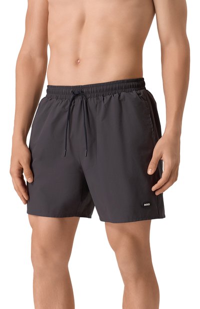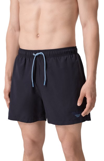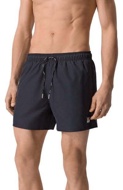 Плавки-шорты с логотипом спереди и лампасами в цветах фирменного триколора выполнили из быстросохнущего материала на основе эластомультиэстера. Модель с эластичным поясом-кулиской дополнили боковыми карманами и накладным задним.