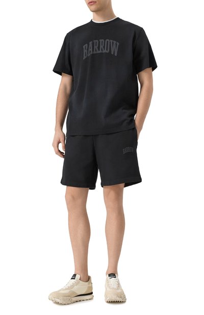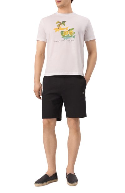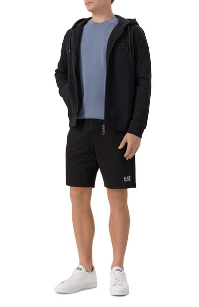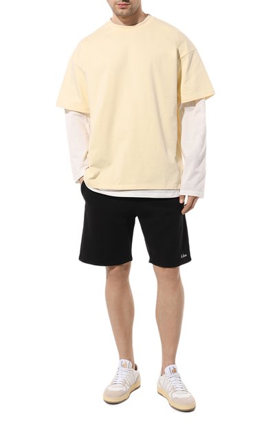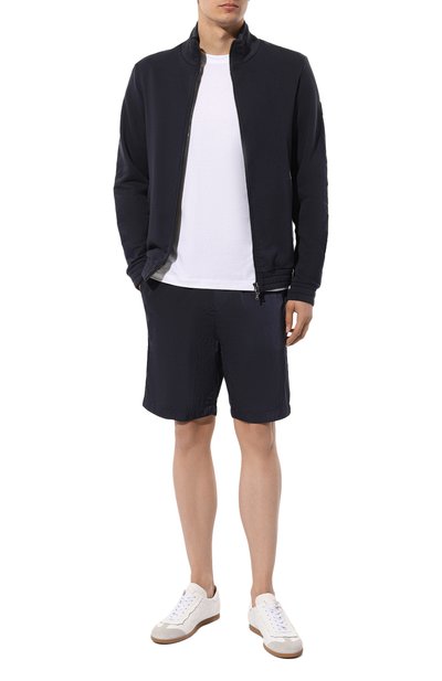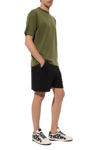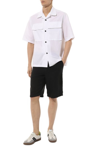 Шорты с широким поясом-кулиской выполнили из хлопкового трикотажа. Модель с двумя врезными карманами украсили по бокам тесьмой в цветах фирменного триколора.