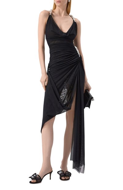 Атласное платье-футляр с высокой шлицей сзади и отворотом вдоль линии декольте дополнили регулируемыми бретелями. Модель застегивается потайной молнией на спинке.