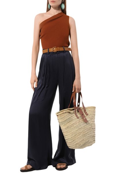 Брюки с парными защипами спереди и отглаженными стрелками выполнили из тонкой шерстяной ткани. Модель с завышенной посадкой на талии дополнили боковыми и задними карманами.
