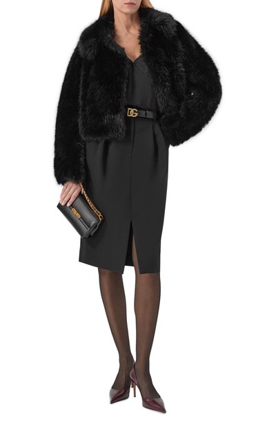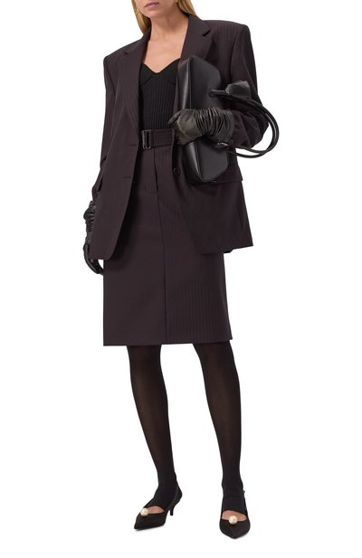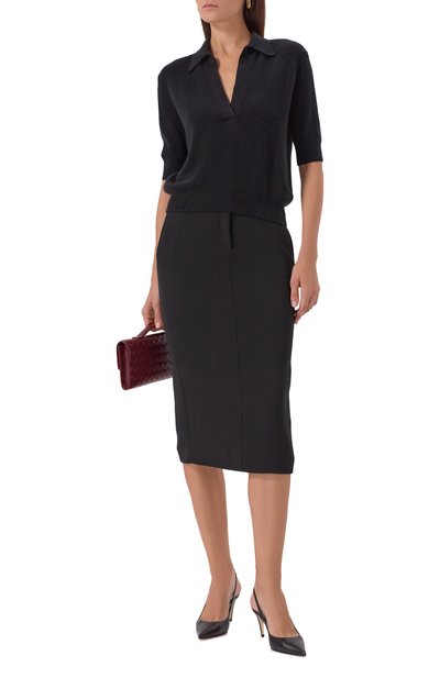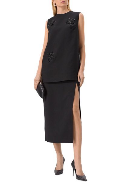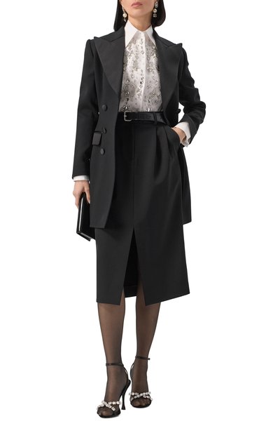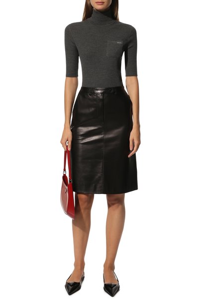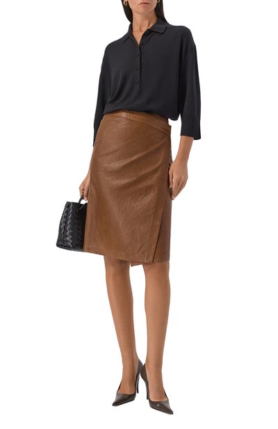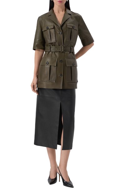 Юбку из мелкозернистой кожи дополнили высоким разрезом спереди и шлицей сзади. Помимо боковых карманов предусмотрели задние с листочками. Модель со шлевками на поясе застегивается потайной боковой молнией.