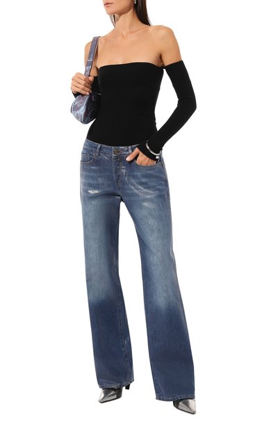 Широкие джинсы свободного кроя сшиты из хлопкового денима с декоративными потертостями. Модель с высокой посадкой и пятью карманами легко впишется в повседневный гардероб.