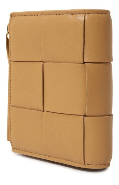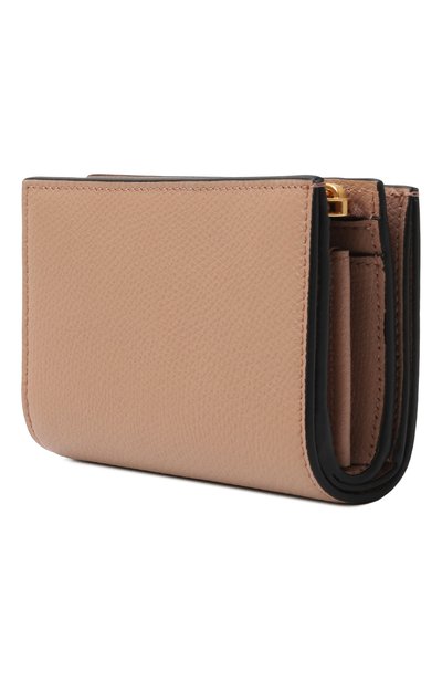 Для изготовления портмоне-книжки с золотистой монограммой VLogo Signature использовали зернистую телячью кожу. Внутри аксессуара на кнопке предусмотрели отделение для банкнот, карман на молнии и пять слотов для карт.