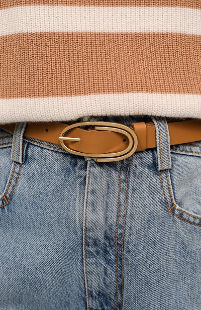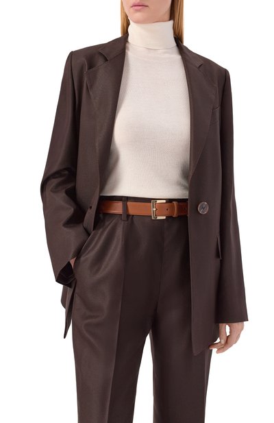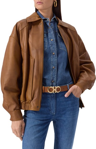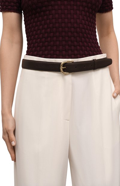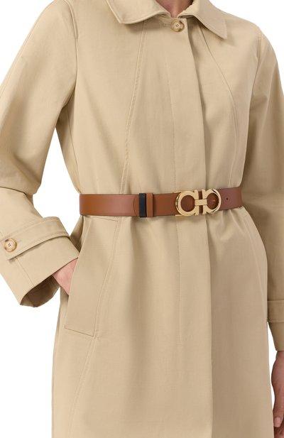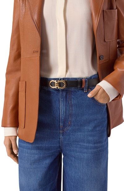 Двусторонний ремень средней ширины выполнили из зернистой телячьей кожи. Аксессуар с парой тренчиков регулируется кобурной пряжкой Gancini.