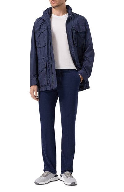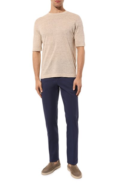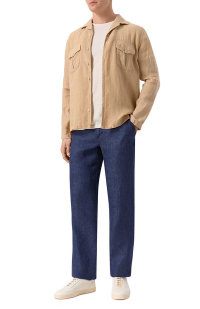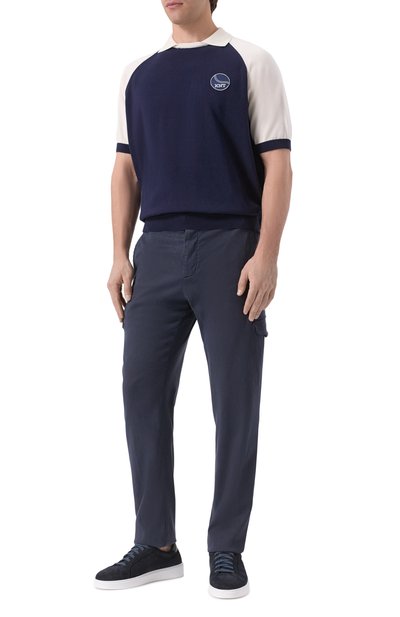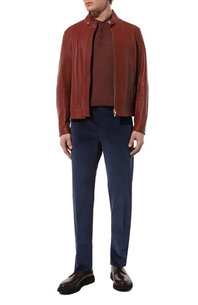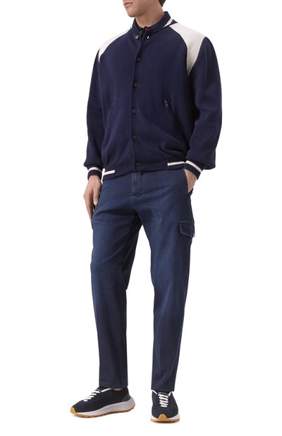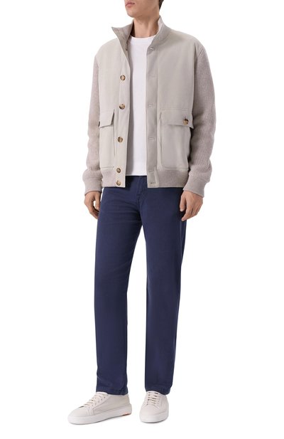 Брюки сшили из хлопкового вельвета с добавлением кашемира. Модель с боковыми и задними прорезными карманами дополнили парой карго с клапанами. Из декора — фирменный ярлык спереди и жакрон на поясе.