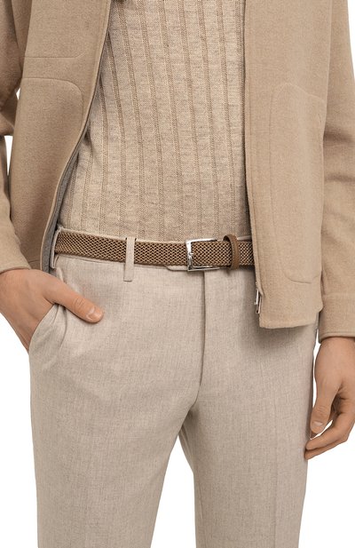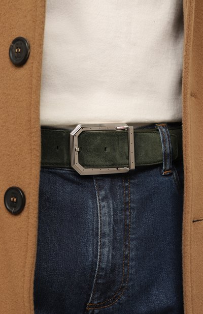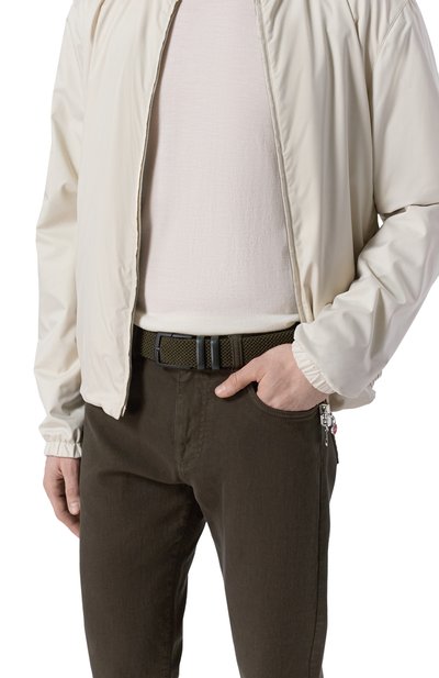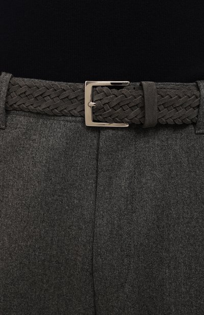 Ремень средней ширины выполнили из эластичного рифленого текстиля. Аксессуар с фиксированной шлевкой и основанием из замши регулируется прямоугольной полированной пряжкой.