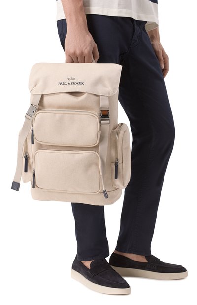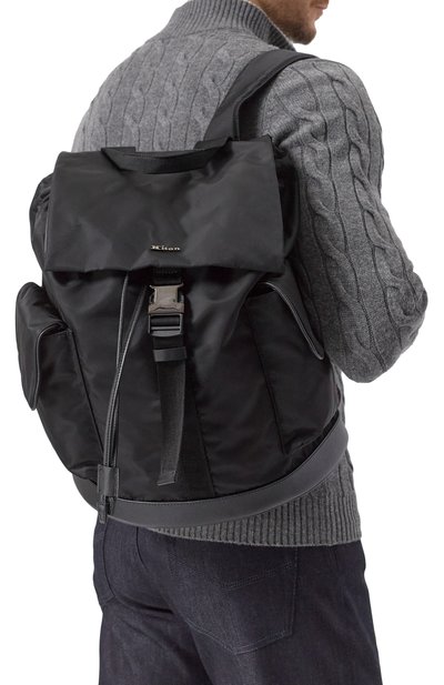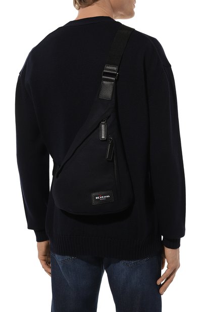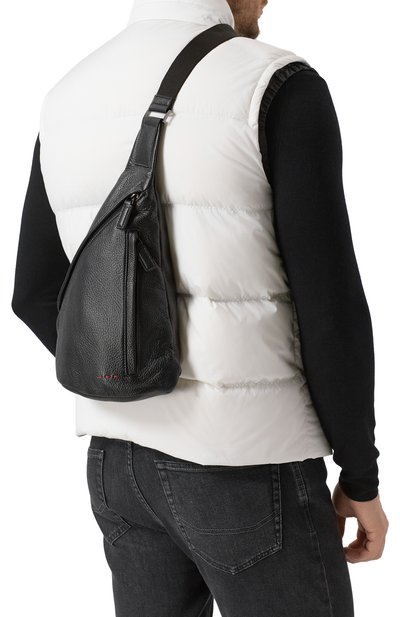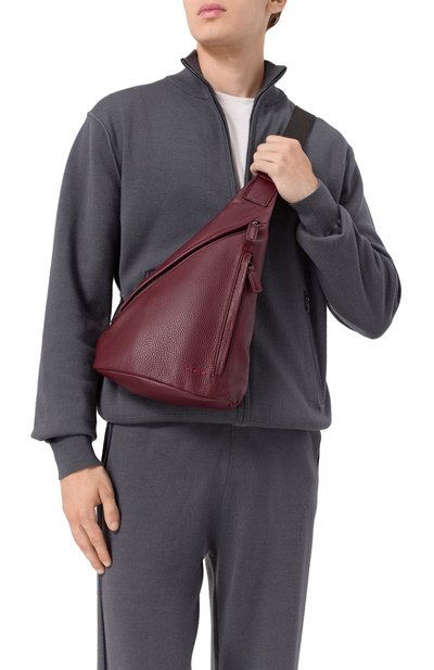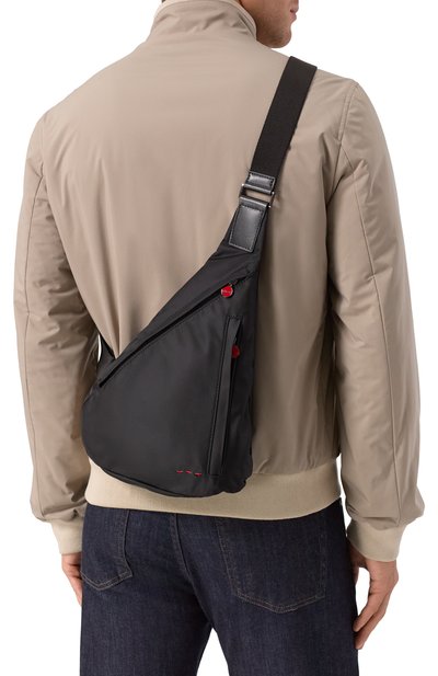 Треугольный рюкзак на одной регулируемой лямке выполнили из плотного текстиля. Основное отделение и внешний карман застегиваются молниями с брендированными пуллерами фирменного алого оттенка, которым вторят три стежка на передней панели.