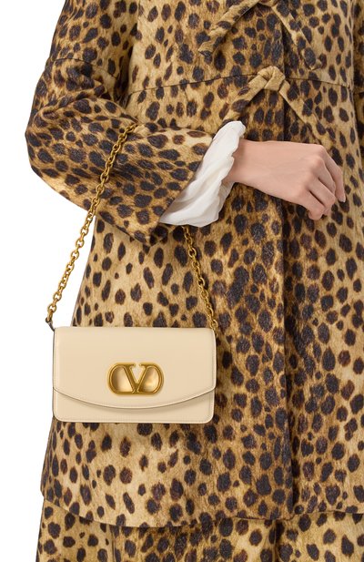 Сумку Vain из телячьей кожи дополнили съемными ручкой-цепочкой и регулируемым ремнем. Клапан на магнитной кнопке подчеркнули эмблемой VLogo Signature. Внутри предусмотрели карточный слот.