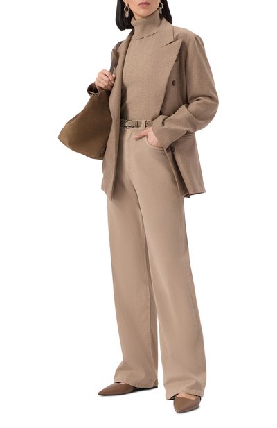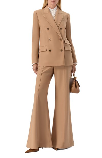 Двубортный жакет с заостренными лацканами выполнили из сертифицированной шерсти caviar. Oversize-модель с акцентированной линией плеч и двумя шлицами дополнили нагрудным и парой боковых карманов с клапанами.