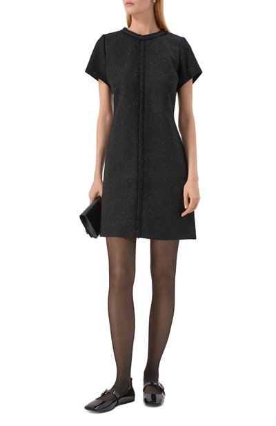 Мини-платье с короткими рукавами и двумя нагрудными карманами сшито из фольгированного органического хлопка. Эластичная модель с расклешенным подолом застегивается брендированными пуговицами.