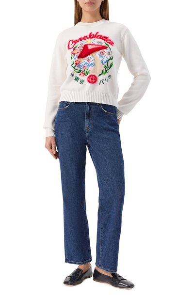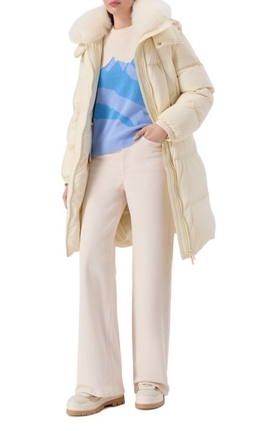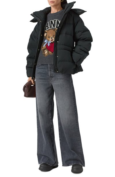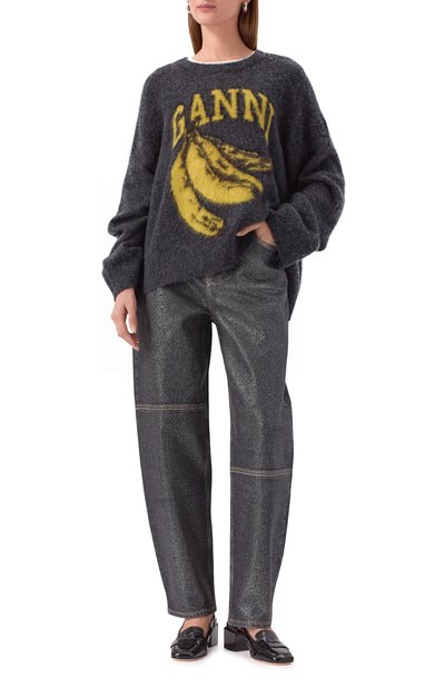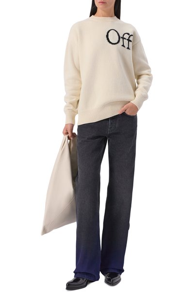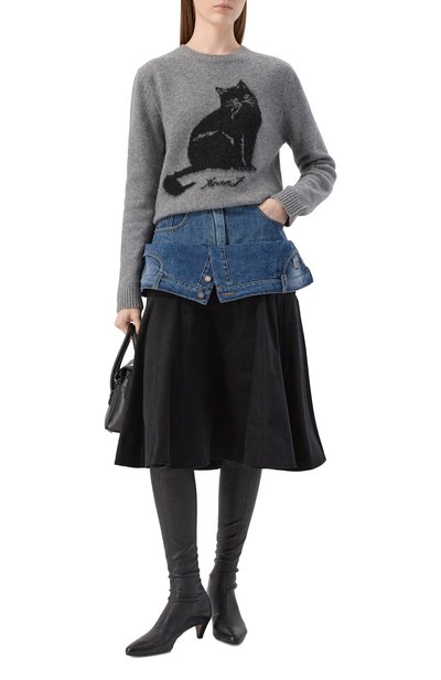 Свитер с горловиной, манжетами и широким поясом в рубчик связан из шерстяной пряжи, укрепленной полиамидом. Модель украшена спереди логотипом марки, изображением пуделя и говорящей надписью.