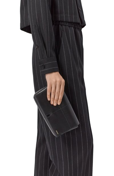 Сумку Brioche Pouch со съемным регулируемым плечевым ремнем выполнили из зернистой кожи. Аксессуар, застегивающийся встречной молнией, украсили лентами с узлами по бокам и тисненым логотипом спереди.