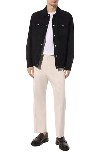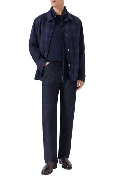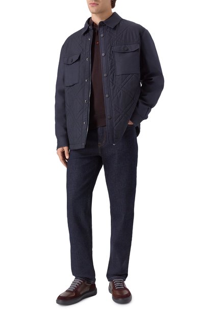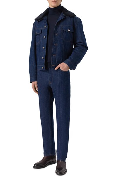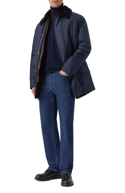 Джинсовую куртку-рубашку на шерстяном подкладе дополнили регулируемыми ремешками на поясе и четырьмя карманами. Воротник модели из жесткого денима украсили трикотажной накладкой с арановым узором.