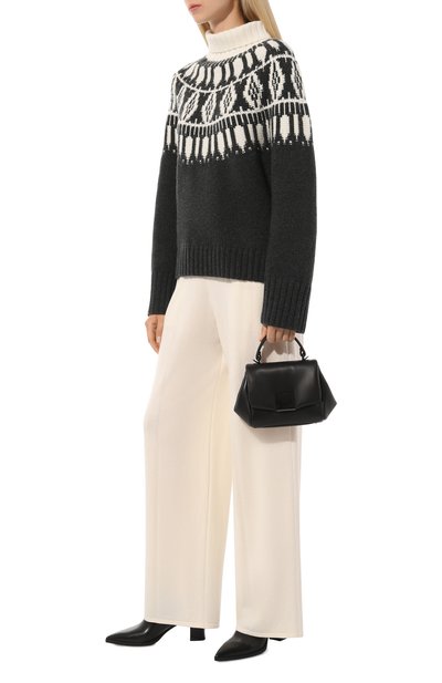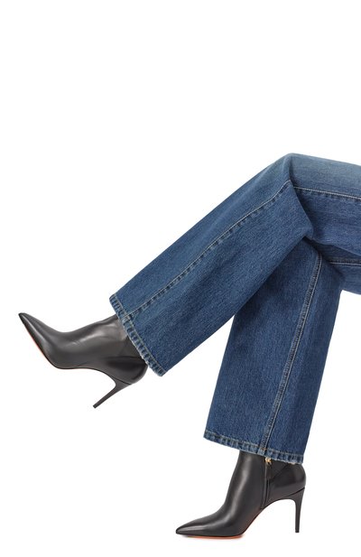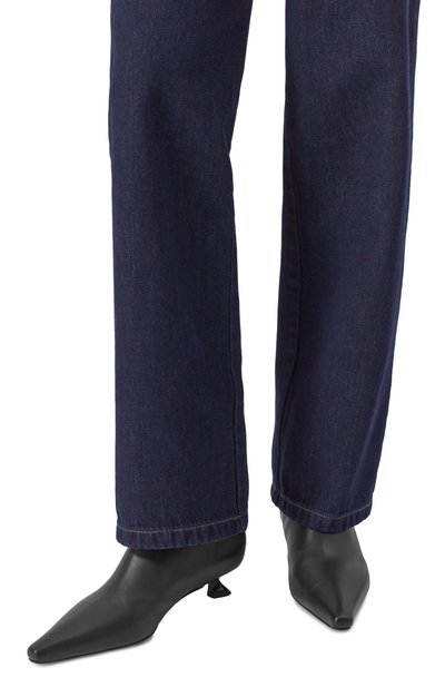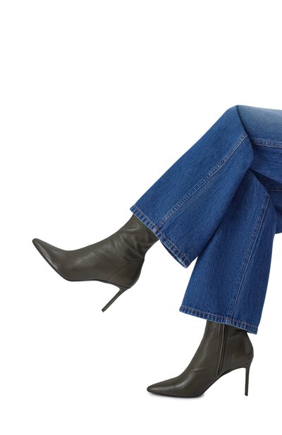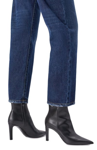 Ботильоны на каблуке kitten heel выполнили из кожи и замши. Модель с зауженным мысом и короткой боковой молнией украсили ремешком с металлической брендированной пряжкой сверху голенища.