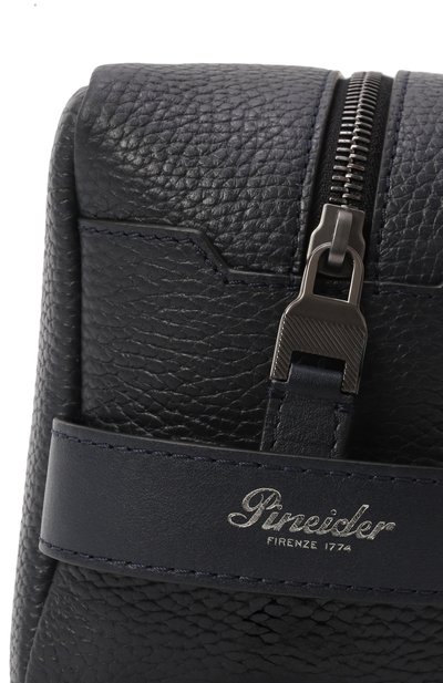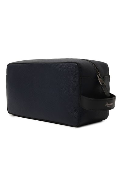 Для создания несессера выбрали текстиль с рисунком, имитирующим фактуру сафьяна. Наружный карман подчеркнули накладкой из патинированной кожи, выполнив из такого же материала брендированную боковую ручку. У аксессуара предусмотрели два основных отсека на молниях, разместив в заднем еще один карман фирменного оттенка Arancio Santoni.