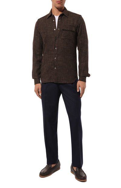 Лоферы Detroit с мокасиновым швом и фигурной перемычкой сшили из замши и окрасили в фирменной технике velatura. Модель, отделанную внутри гладкой кожей, установили на резиновую подошву. По бока м – стежки знакового оранжевого оттенка Arancio Santoni.