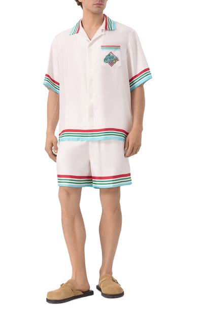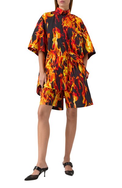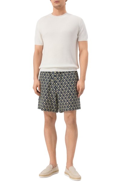 Для пошива шортов использовали вискозу с брендированным узором Foulard Chaines. Модель с широким эластичным поясом дополнили двумя врезными боковыми карманами.