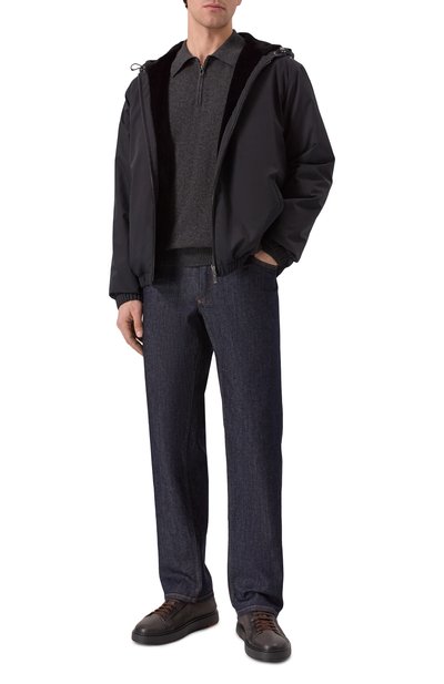 Анорак с поясом-резинкой и эластичными манжетами-митенками выполнили из полиамида стрейч. Регулируемый капюшон дополнили козырьком, спереди предусмотрели крупный карман с тремя входами, а на рукаве разместили отсек для ски-пасса. Модель с вышитой эмблемой Solomeo застегивается контрастной молнией с защитой от защемления.