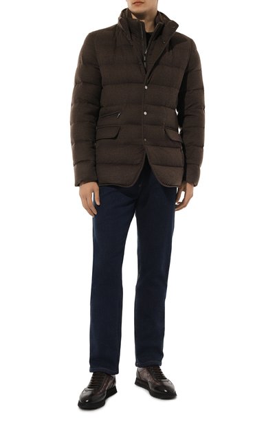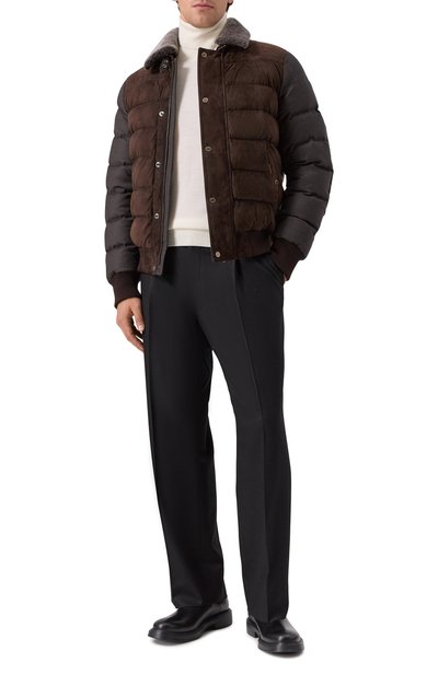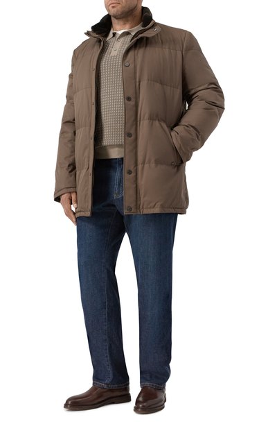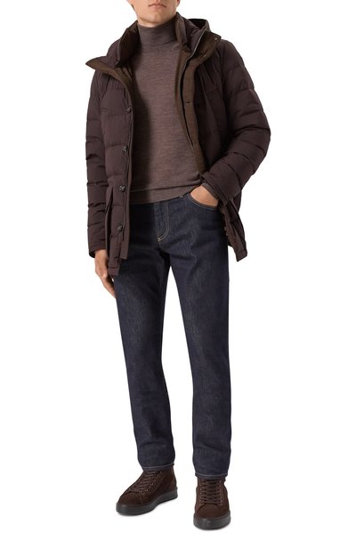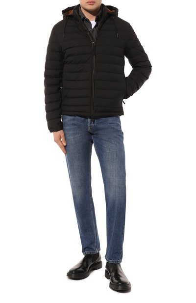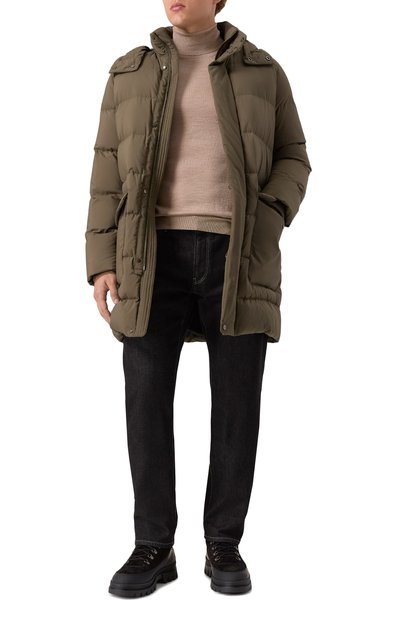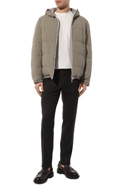 Стеганую куртку на гусином пуху изготовили из эластичного нейлона. Модель со съемным регулируемым капюшоном, манжетами из трикотажа в рубчик и боковыми карманами застегивается встречной молнией.