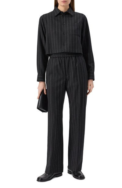 Для пошива прямых брюк с защипами спереди использовали костюмную шерсть в меловую полоску. Модель с четырьмя карманами застегивается на молнию, пуговицу и крючок. Задняя шлевка украшена фирменной цепочкой мониль.
