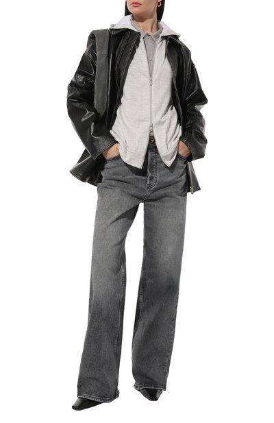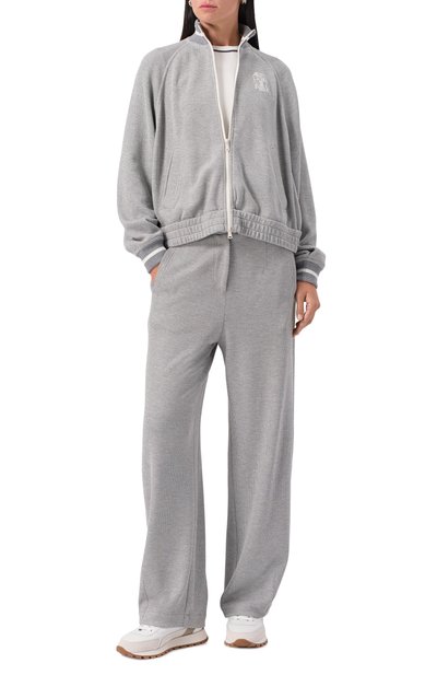 Толстовку на встречной молнии сшили из меланжевого пике Sparkling из вискозы и хлопка с добавлением люрекса. Модель с эластичным поясом и двумя карманами украшена вышитой эмблемой Solomeo. Манжеты и высокая горловина выполнены из ребристого трикотажа в полоску.