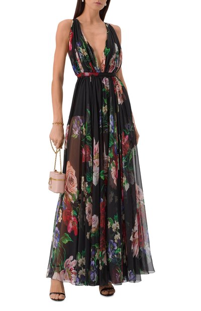 Платье с боковыми карманами сшили из шелка pongee с принтом Papyrus, подчеркнув низ двойной полосой. Модель с полуподкладом из крепа дополнили бретелями-завязками из цепочки мониль, которые перекрещиваются на открытой спине и охватывают талию.