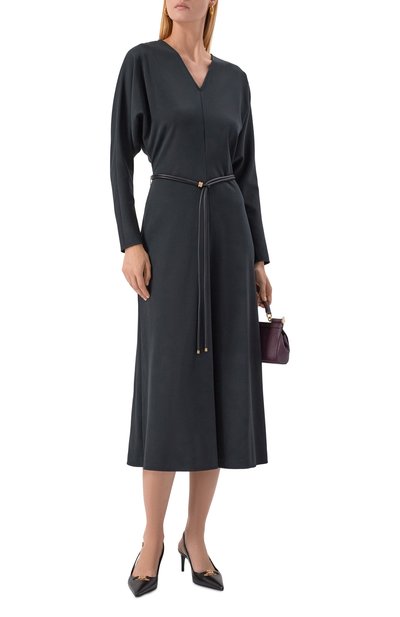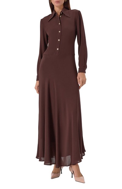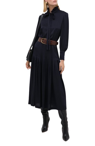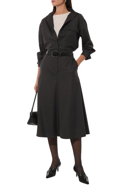 Платье-рубашку со спущенной линией плеч выполнили из стрейчевой шерсти. Модель с эластичной вставкой на талии и четырьмя карманами застегивается контрастными кнопками. Верх отложного воротника расшили цепочкой мониль.