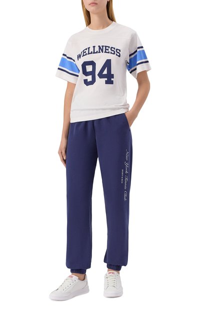 Футболку с контрастными горловиной и рукавами выполнили из предварительно постиранного хлопкового трикотажа. Модель украсили флокированной надписью Wellness Club спереди и логотипом на спинке.