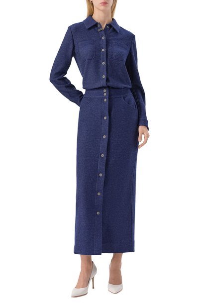 Джинсовая миди-юбка с широким поясом и двумя врезными карманами сшита из эластичного хлопкового денима с добавлением кашемира. Модель застегивается спереди фирменными пуговицами.
