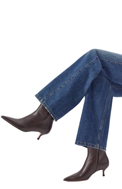 Ботильоны с зауженным мысом выполнили из гладкой кожи. Модель на скульптурном каблуке kitten heel застегивается сбоку молнией с брендированным пуллером.