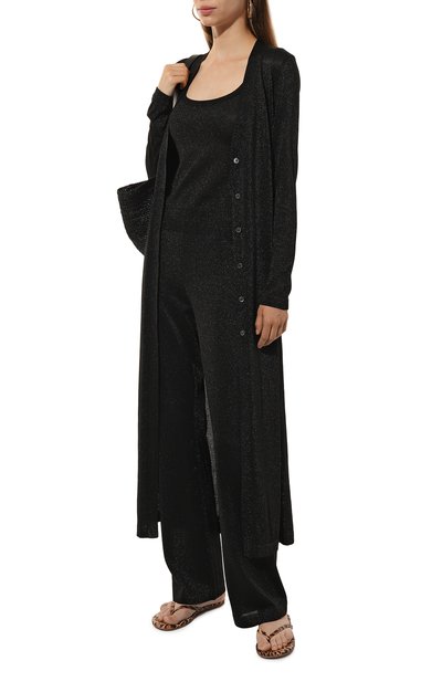 Удлиненный кардиган на пуговице связали из шерстяной пряжи. Глубокий V-образный вырез подчеркнули широким воротником из перьев в тон.