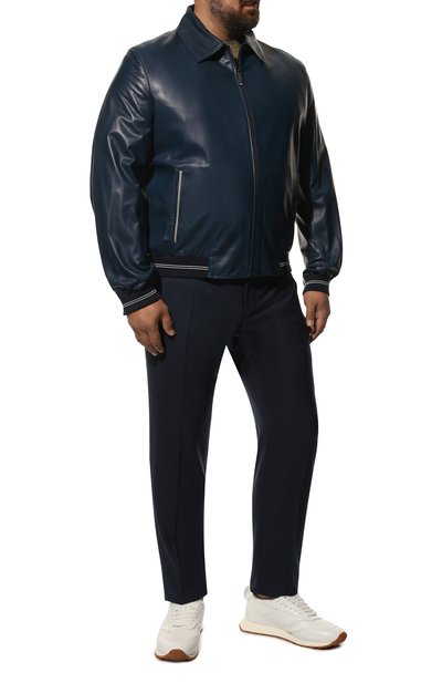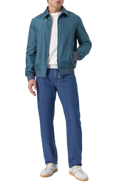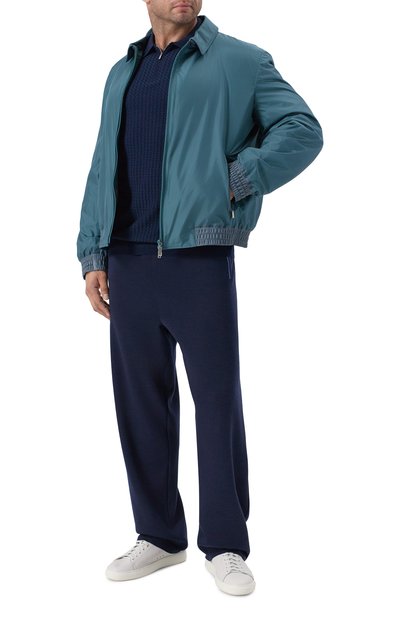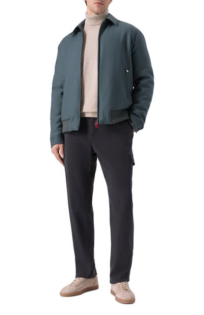 Бомбер из ворсованного кашемира застегивается встречной молнией с брендированными пуллерами. Куртку на подкладе из шелка стрейч дополнили эластичными манжетами и поясом, а так же боковыми карманами с листочками. Воротник-стойку с ремешком на кнопке и трикотажной отделкой укрепили узким кожаным кантом в тон.