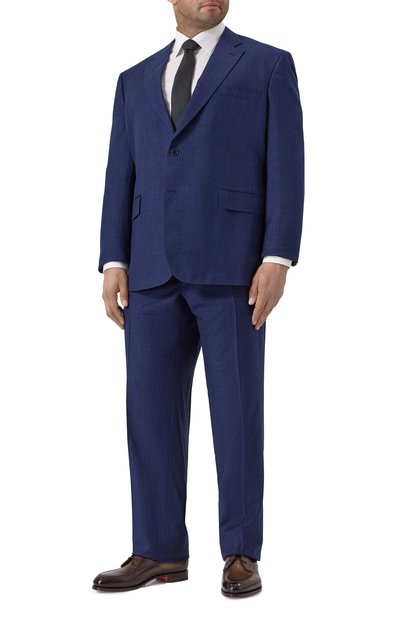 Для изготовления клетчатого костюма использовали чистую шерсть. Пиджак с парой шлиц сзади дополнили нагрудным и двумя боковыми карманами, а у брюк предусмотрели четыре кармана.