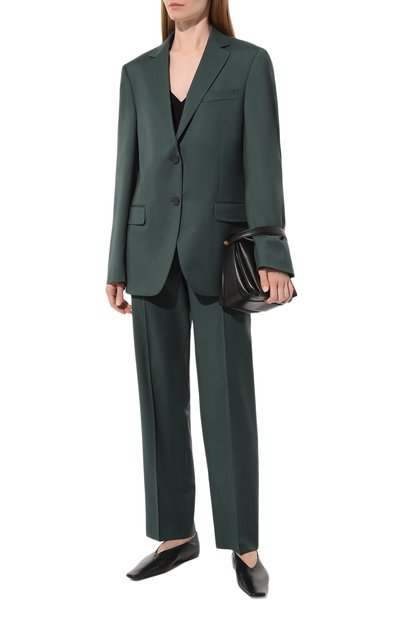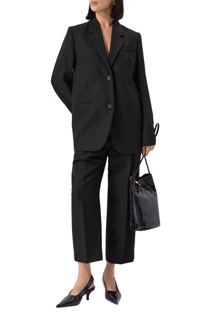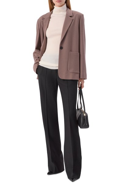 Однобортный жакет с широкими лацканами выполнили из шерстяного трикотажа. Модель на полуподкладе дополнили боковыми карманами с клапанами.