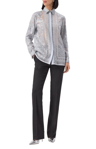 Лаконичные прямые брюки выполнили из шерстяного трикотажа. Модель органично дополнит нестрогий образ, например, с майкой и парным жакетом.