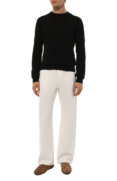 Джемпер со спущенной линией плеч выполнили в технике двухцветной вязки из микса шерсти и льна. Круглую горловину модели укрепили эластичным кантом.