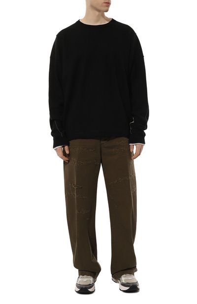 Джемпер со спущенной линией плеч выполнили в технике двухцветной вязки из м икса шерсти и льна. Круглую горловину модели укрепили эластичным кантом.